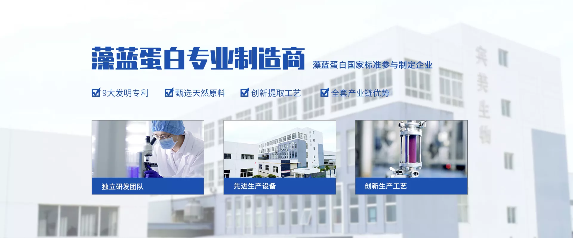 的提取分离及应用。特别在藻类活性蛋白领域,累积了丰富的经验,获得9项国家专利,是目前少数能够工业化生产藻蓝蛋白的科技型企业之一,宾美生物也是藻蓝蛋白国家标准参与制定的企业之一。