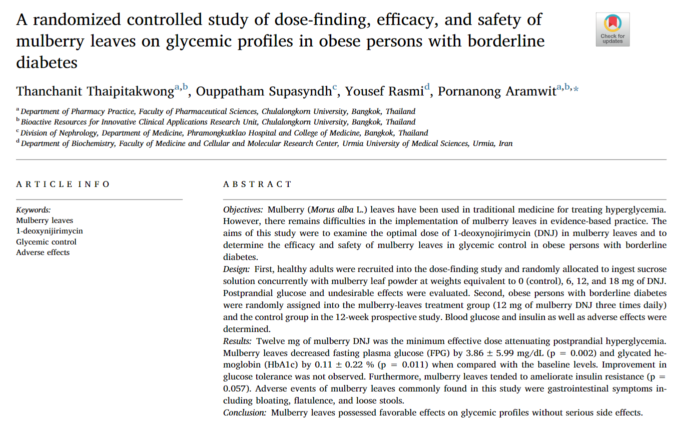 [1]Thaipitakwong, T., Supasyndh, O., Rasmi, Y., & Aramwit, P. (2020). A randomized controlled study of dose‑finding, efficacy, and safety of mulberry leaves on glycemic profiles in obese persons with borderline diabetes. Complementary Therapies in Medicine, 49, 102292.